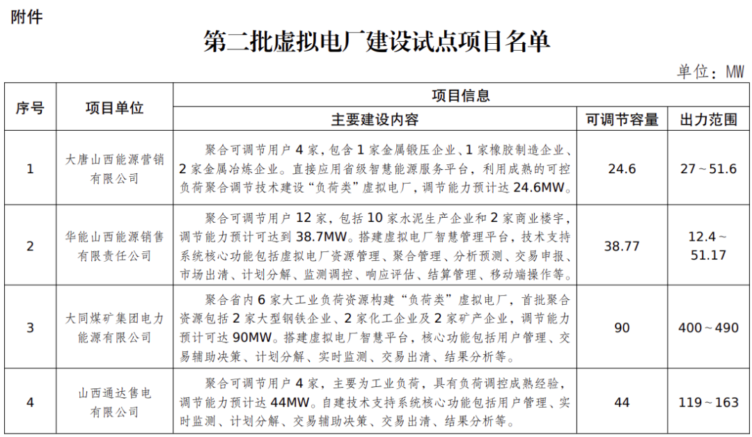 各相關(guān)市場主體: 根據(jù)我省《虛擬電廠建設(shè)與運(yùn)營管理實(shí)施方案》要求,我局委托國網(wǎng)山西電科院對(duì)申報(bào)的一批虛擬電廠項(xiàng)目實(shí)施方案進(jìn)行評(píng)估。根據(jù)評(píng)估結(jié)果,擬確定6個(gè)方案相對(duì)成熟的項(xiàng)目作為第二批虛擬電廠建設(shè)試點(diǎn)項(xiàng)目,現(xiàn)予以公示,公示期為5個(gè)工作日。對(duì)項(xiàng)目評(píng)估結(jié)果有異議的,請(qǐng)?jiān)诠酒趦?nèi)向山西省能源局提出書面反饋,反映情況須客觀真實(shí)。以單位名義反映情況的材料需加蓋單位公章;以個(gè)人名義反映情況的材料應(yīng)實(shí)名并提供有效聯(lián)系方式。反饋資料發(fā)送至郵箱:sxsnyjdlc@163.com,聯(lián)系電話:0351-4117152。