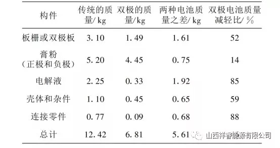 目前,除了動力鋰電池外,我國動力蓄電池的需求量增長也很明朗。隨著電動汽車的發(fā)展,與其配套的鉛酸蓄電池也得到了相應(yīng)的發(fā)展。蓄電池的使用壽命是制約著電動汽車發(fā)展的重要因素之一,所以,提高鉛蓄電池的使用壽命至關(guān)重要。影響鉛酸蓄電池使用壽命的因素主要包括,與之相配套的充電器、自身質(zhì)量、用戶使用方式是否正確等。 提高蓄電池質(zhì)量,可以從鉛膏及固化入手,鉛膏添加劑是從事鉛酸電池研究的人員長期研究的內(nèi)容之一,鉛膏主要作用是改善正極的導(dǎo)電性能,增加正極的孔率,改善負(fù)極充電接受能力和防止極板的硫鹽化。多數(shù)充電器在指示燈變燈指示充滿電以后,電池充入電量可能是97%~99%。雖然僅欠充電1%~3%的電量,對續(xù)行能力的影響幾乎可以忽略,但是也會形成欠充電積,所以電池充滿電變燈以后還是盡可能繼續(xù)進(jìn)行浮充電,這樣對抑制電池硫化也是有好處的。 目前,除了動力鋰電池外,我國動力蓄電池的需求量增長也很明朗。電動汽車所用的動力鉛酸蓄電池種類多樣化,包括雙極性鉛酸蓄電池、水平鉛酸蓄電池,以及卷式電池等。雙極性密封鉛酸蓄電池最早是由美國Arias公司開發(fā)的,是一面有正極活性物質(zhì),另一面有負(fù)極活性物質(zhì)的堅實(shí)薄片極板的電池,具有較高的比能量。 普通鉛酸電池的極板是豎立著放置的,而雙極性鉛酸蓄電池的電極是平臥著放置的。電極水平臥著放置是為了防止電解液層化,和活性物質(zhì)剝離,以及便于采用輕量薄形電極基片。通過采用雙極性結(jié)構(gòu),大大減輕了鉛酸電池的質(zhì)量,提高了設(shè)計效率。如表1,是對傳統(tǒng)的12V12Ah鉛酸電池與雙極性24V12Ah鉛酸電池零件分解質(zhì)量的比較。